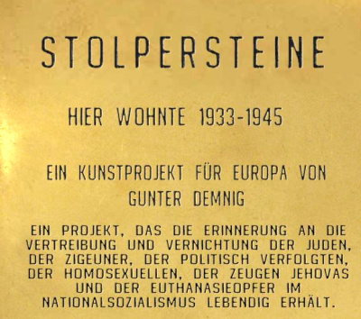 Stolpersteine nennt sich ein Projekt des Künstlers Gunter Demnig. Mit Gedenktafeln will er an das Schicksal der Menschen erinnern, die in der Zeit des Nationalsozialismus verfolgt, ermordet, deportiert, vertrieben oder in den Suizid getrieben wurden.Demnigs Intention ist unter anderem, den NS-Opfern, die in den Konzentrationslagern zu Nummern degradiert wurden, ihre Namen zurückzugeben.