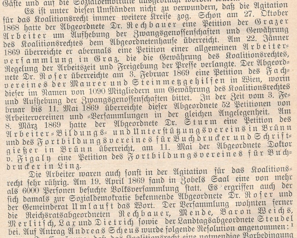 Bestimmt durch das entschiedene Auftreten der großen Volksmassen, welche heute am Eröffnungstage des Reichsrathes erschienen sind, um den so oft in Versammlungen und durch Petitionen ausgesprochenen Forderungen Nachdruck zu geben, haben die Unterfertigten beschlossen, das Ministertum zu ersuchen, im Interesse der Wohlfahrt des österreichischen Volkes dahin zu wirken, daß bei Beginn der Reichsrathssession das unbeschränkte Koalitionsrecht bewilligt und das Gesetz über die Zwangsgenossenschaften beseitigt werde; daß ferner noch im Laufe dieser Session dem Reichsrathe eine Vorlage gemacht werde bezüglich der Herstellung des völlig freien Vereins- und Versammlungsrechtes, – der absoluten Preßfreiheit und der Einführung des gleichen und direkten Wahlrechtes.