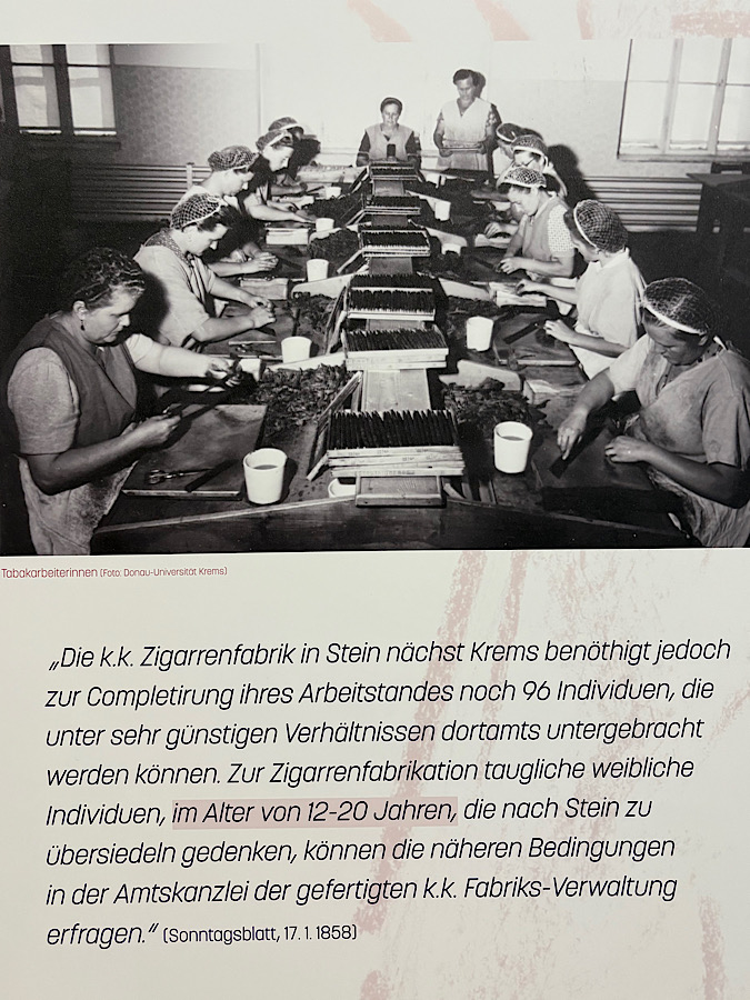 Solche Ereignisse und die Geschichte der Tabakfabrik schilderte uns Edith Blaschitz, Assistenzprofessorin und Historikerin an der Universität für Weiterbildung in Krems, bei unserer Führung durch die Ausstellung “Geschichte der Tabakfabrik Stein – zwischen Wohlfahrt und Widerstand“.
