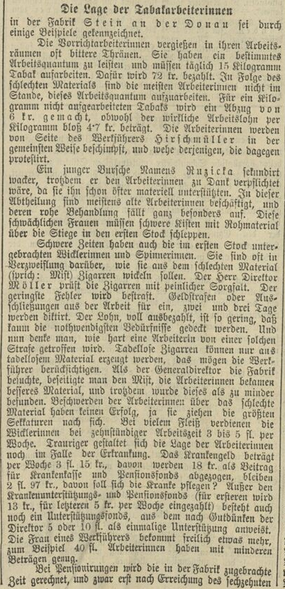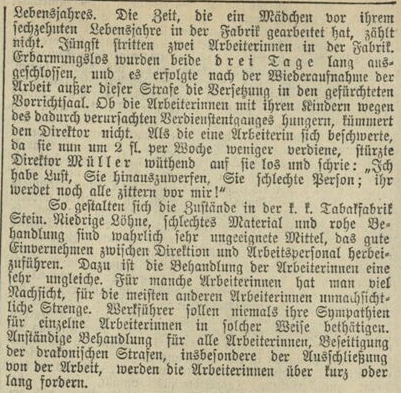 Wenn eine Frau, die seit 20 Jahren fleißig für die Tabakfabrik arbeitet, ihre Bestrafung eines wöchentlichen Lohnabzugs nicht anerkennt, wird sie entlassen. An die hundert Arbeiterinnen erklärten sich mit ihr solidarisch und sie erregten einen Exzess durch Schreien, Fluchen, Poltern und Aufschlagen mit den Werkzeugen auf den Tischen, den die Hauswache beilegen musste.