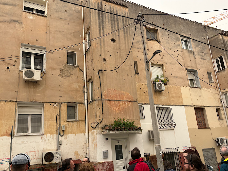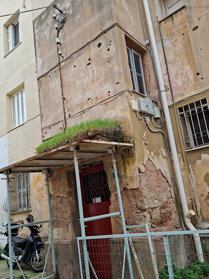 Kostis führt uns Im Athener Vorort Kaisariani zu einer Reihe von ehemaligen Flüchtlingswohnhäusern aus der Zwischenkriegszeit. Ihre Mauern sind von Einschusslöchern aus der Schlacht um Athen 1944 übersät, als britische Truppen die verschanzten Kämpfer der ELAS angriffen, die den Zugang zum Viertel kontrollierten.