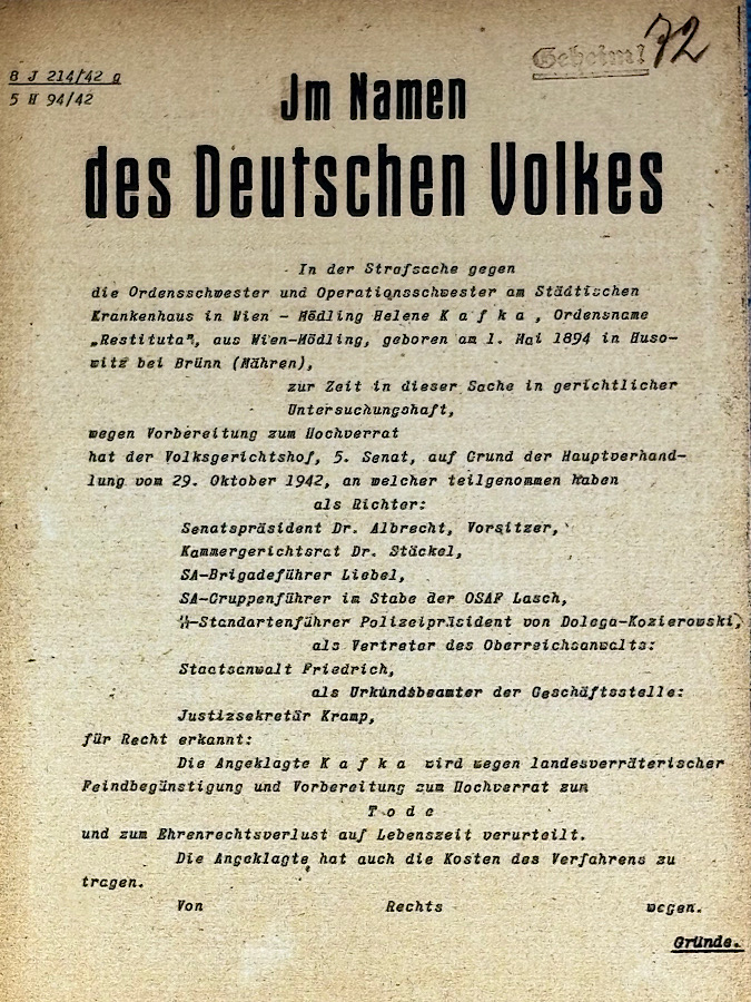 Mit dieser Überschrift beschreibt Werner Kunzenmann in der Dokumentation über die Schwester Restituta ihren Weg von der Einlieferung in das Polizeigefängnis bis zum Hinrichtungsraum im Landesgericht Wien1.