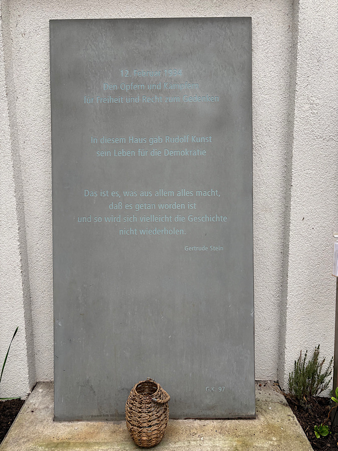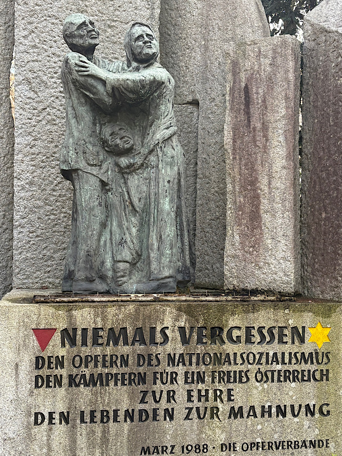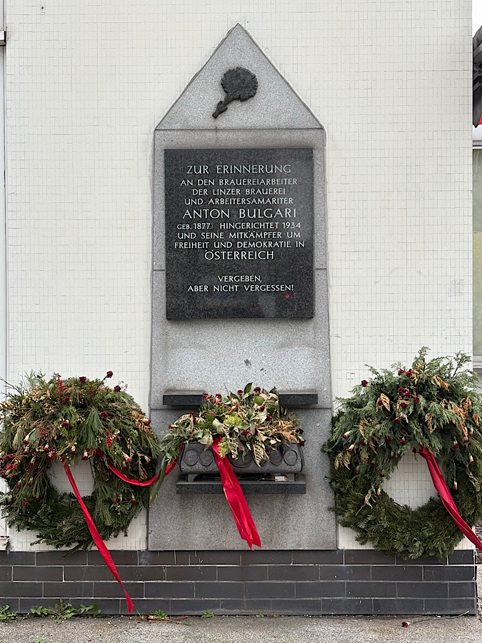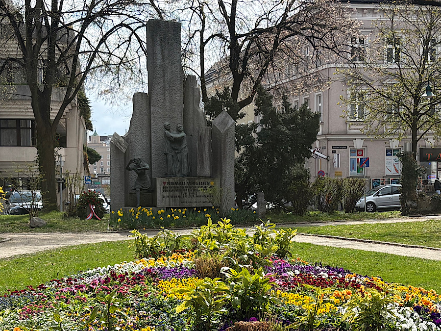 Unsere erste Station war das Denkmal am Bernaschek-Platz, das 1988 von den Opferverbänden errichtet wurde.