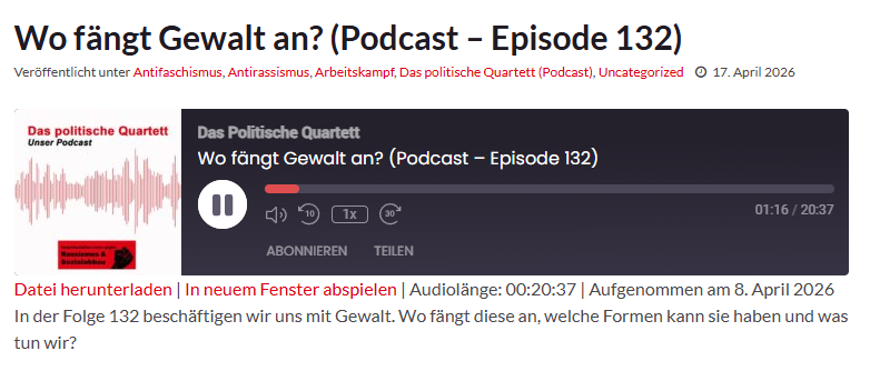 Brigitte und ich waren eingeladen bei einem Podcast der Gewerkschafter:innen gegen Rassismus & Sozialabbau. Eine vierteilige Serie zu diesem Thema. Im Teil 1 gehen wir vom Gewaltdreieck von Johan Galtung in der Arbeitswelt aus und diskutieren was es braucht, dass gewaltfreie Erziehung und Diskussion möglich ist.