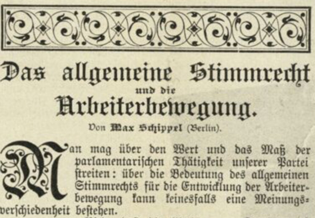 Am Vorabend zum 1.Mai 1891erschien in der Arbeiterzeitung1 in der Rubrik „Es lebe der Achtstundentag“ dieser Artikel. Victor Adler meinte: „Das allgemeine Wahlrecht ist die Voraussetzung für die ökonomische Befreiung der Arbeiter:innen!“